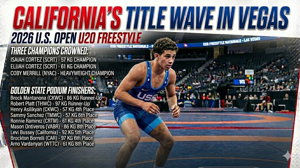 LAS VEGAS, NEV. – The standard for California wrestling continues to climb. After two grueling days at the U.S. Open U20 Freestyle Division, the Golden State has stamped its authority on the national stage, crowning three champions and sending five grapplers to the finals.